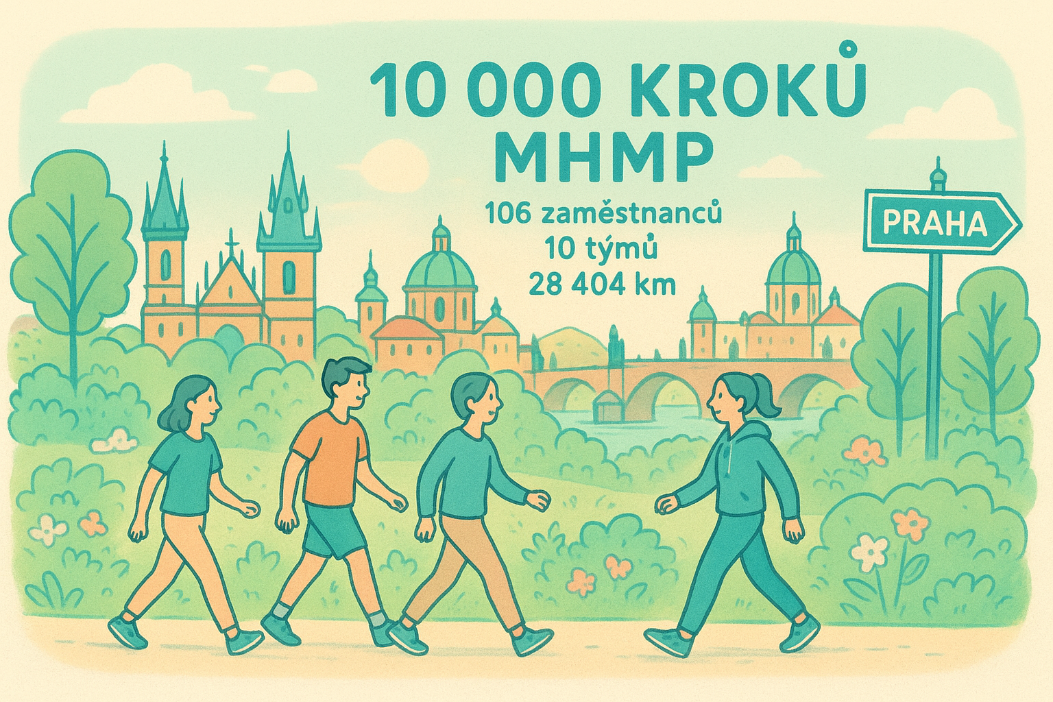 10 000 kroků MHMP, jarní výzva, 106 zaměstnanců, 10 týmů, 28 404 km, chůze, Praha, soutěž o uliční tabulku, hlasování 5.–11.5.2025, vyhlášení 15.5., zdraví, týmová akce, firemní koordinátor: Karolína Klímová
