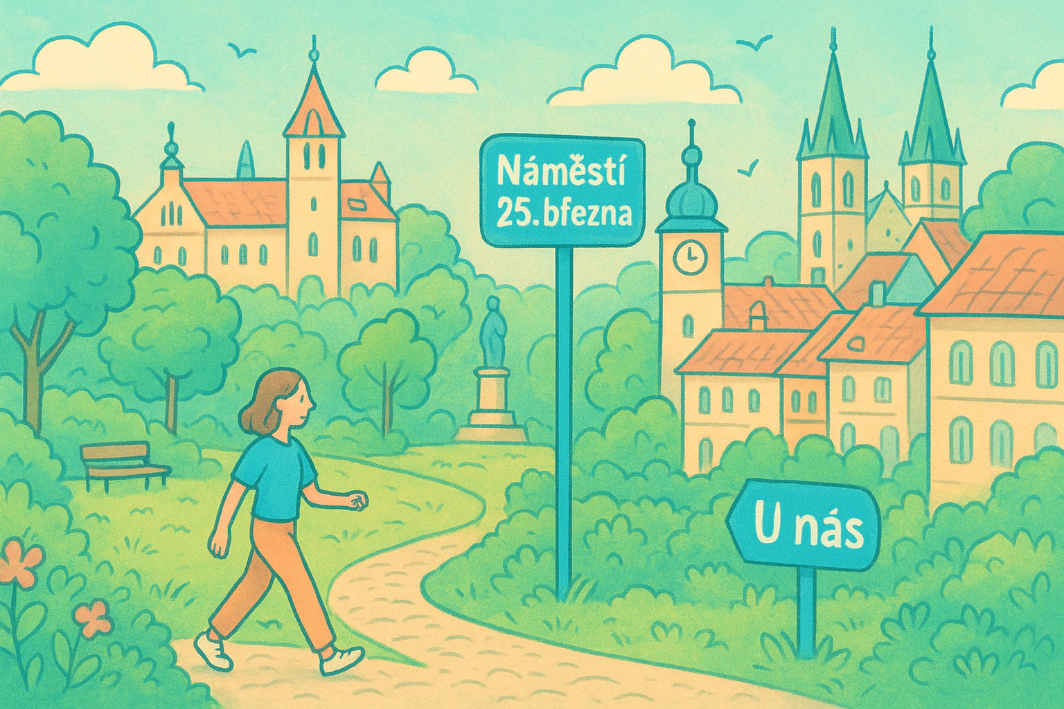Názvy ulic – význam, příběhy, historie, kuriozity (U Úlů, U Luk, Náměstí 25. března, Krokova, Zvonická, U nás), soutěž 10 000 kroků, tradice, tragické události, vtipné názvy, paměť místa.