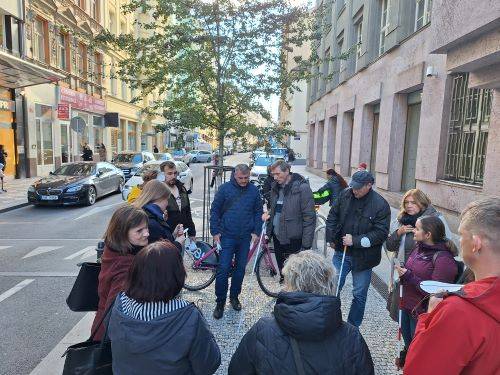 Oblíbeným vzdělávacím formátem výše popsané cílové skupiny je vycházka s bílou holí do pražských ulic pod vedením konzultantů Metodického centra odstraňování bariér Sjednocené organizace nevidomých a slabozrakých v ČR. Během 2-3 hodin v terénu je dostatek času klást obecné i velmi konkrétní otázky z praxe zajišťování přístupnosti pro osoby nevidomé a slabozraké. Obvykle se zaměřujeme na infrastrukturu pro veřejnou hromadnou dopravu (zastávky BUS a TRAM, stanice metra a železnice), ale po domluvě je možné vydat se i do míst aktuální přípravy či realizace investiční akce. Zatím jsme se byli podívat v okolí Masarykova nádraží, na BUS terminálu Želivského, na Basilejském náměstí, u Nuselské radnice, na náměstí Jiřího z Poděbrad, na Palmovce a na Strossmayerově náměstí. Stejně jako v předchozím případě je účast nabízena zdarma, termíny a možnost registrace najdete zde.